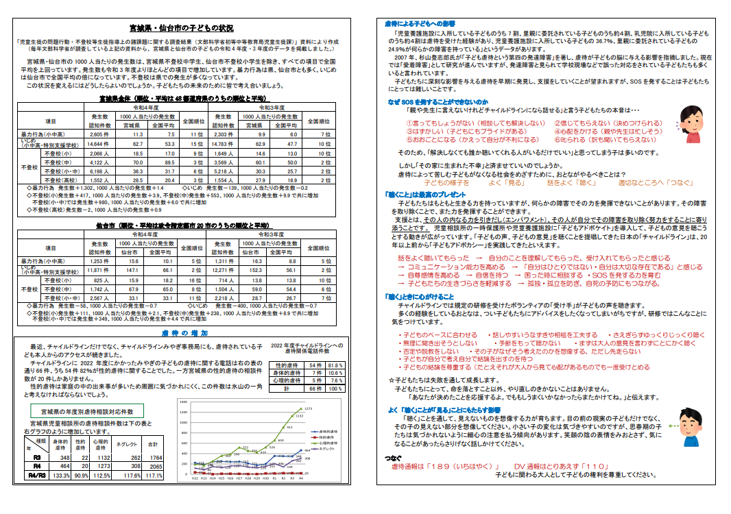 チャイルドラインから見える宮城県の子どもの現在と、宮城県・仙台市の子どもの状況や虐待の現状についてまとめています。